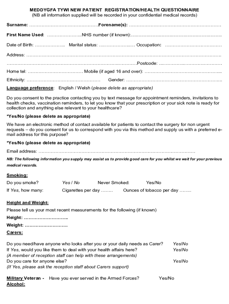 MEDDYGFA TY WI NEW PATIENT REGISTRATION/HEALTH QUESTIONNAIRE (NB all information supplied will be recorded in your confidential medical records) Surname: Forename(s): First Name Used: .NHS number