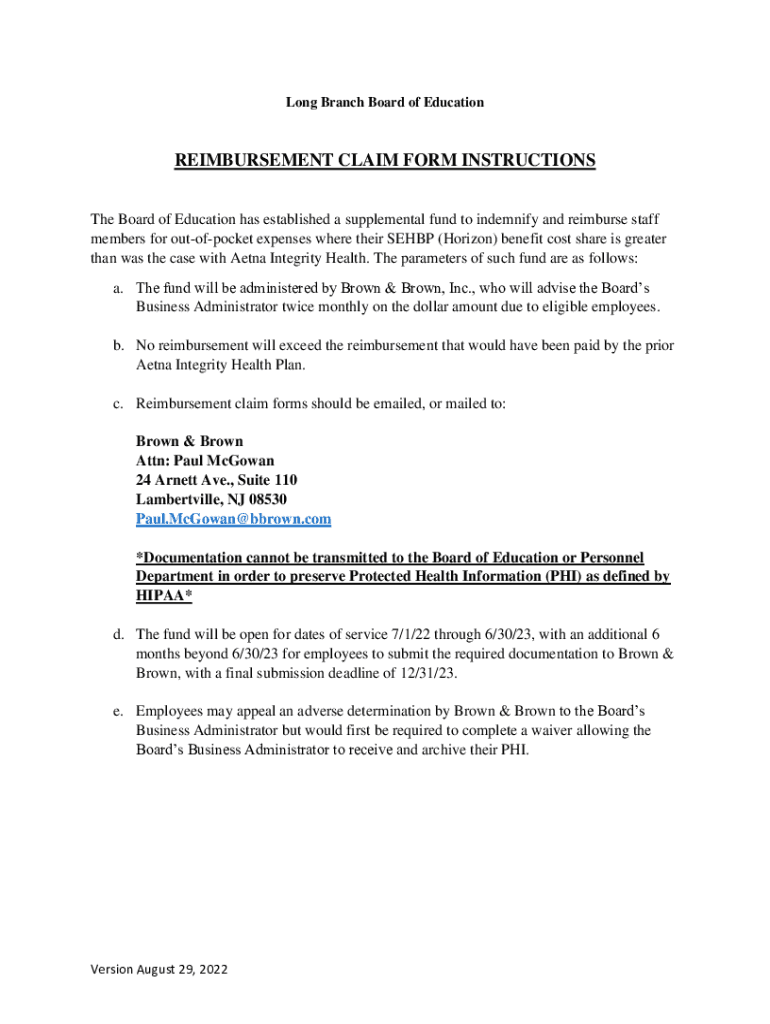 Long Branch Board of EducationREIMBURSEMENT CLAIM FORM INSTRUCTIONS The Board of Education has established a supplemental fund to indemnify and reimburse staff members for outofpocket expenses where