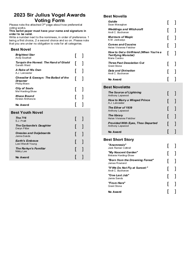 2023 Sir Julius Vogel Awards Voting Formulas note the attached 3rd page about how preferential voting works. This ballot paper must have your name and signature in order to be valid. Write a number