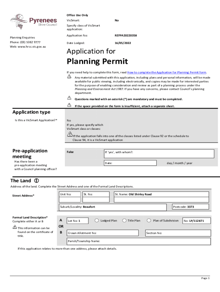 Office Use Only Smart:Specify class of Smart application: Planning Inquiries Phone: (03) 5382 9777 Web: www.hrcc.vic.gov.auApplication No:REFPA20220358Date Lodged:16/05/2022Application planning Permit