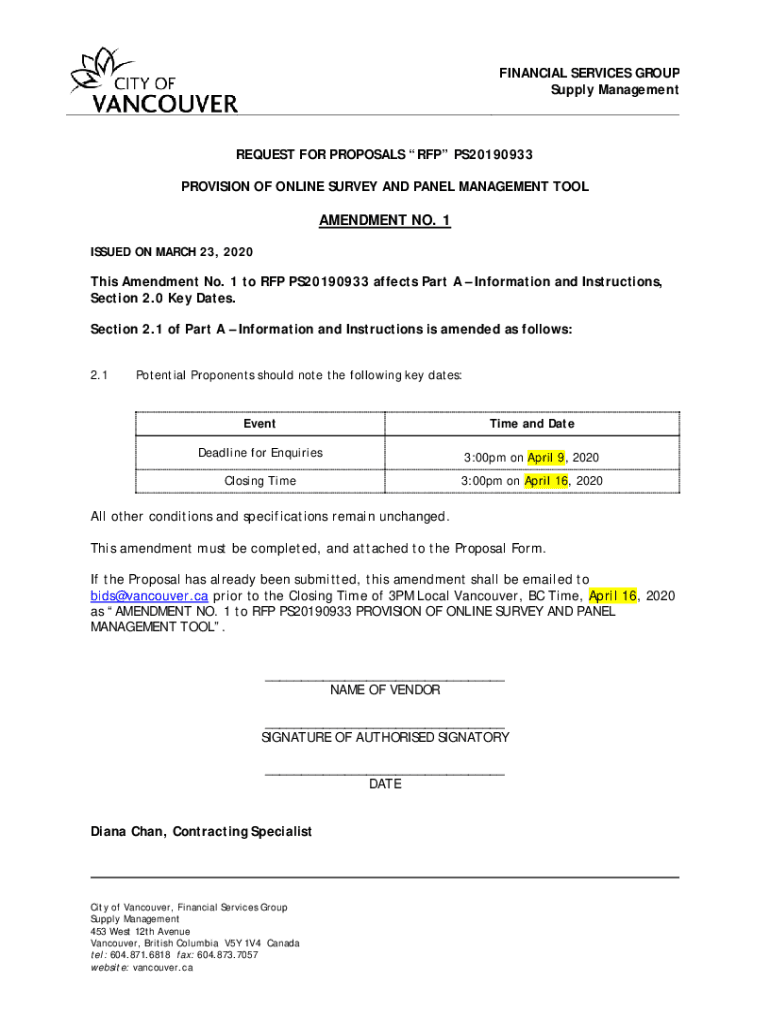FINANCIAL SERVICES GROUP Supply ManagementREQUEST FOR PROPOSALS RFP PS20190933 PROVISION OF ONLINE SURVEY AND PANEL MANAGEMENT TOOLAMENDMENT NO. 1 ISSUED ON MARCH 23, 2020This Amendment No. 1 to RFP