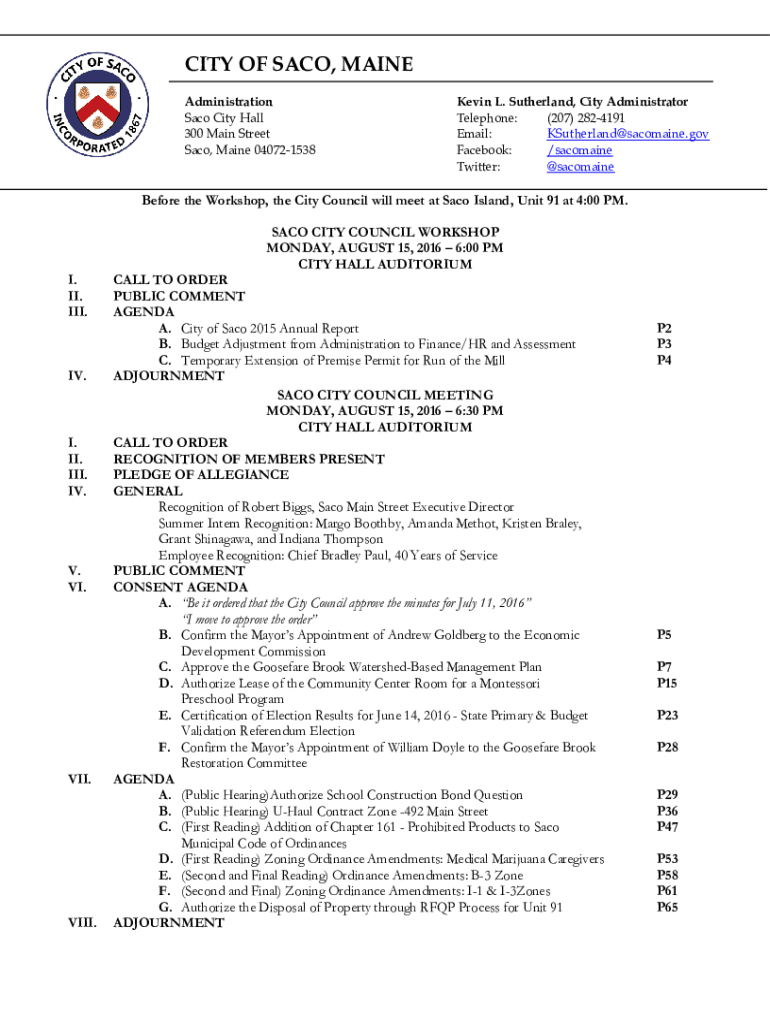 CITY OF SACK, MAINE Administration Sack City Hall 300 Main Street Sack, Maine 040721538Kevin L. Sutherland, City Administrator Telephone: (207) 2824191 Email: KSutherland@sacomaine.gov Facebook: /cocaine