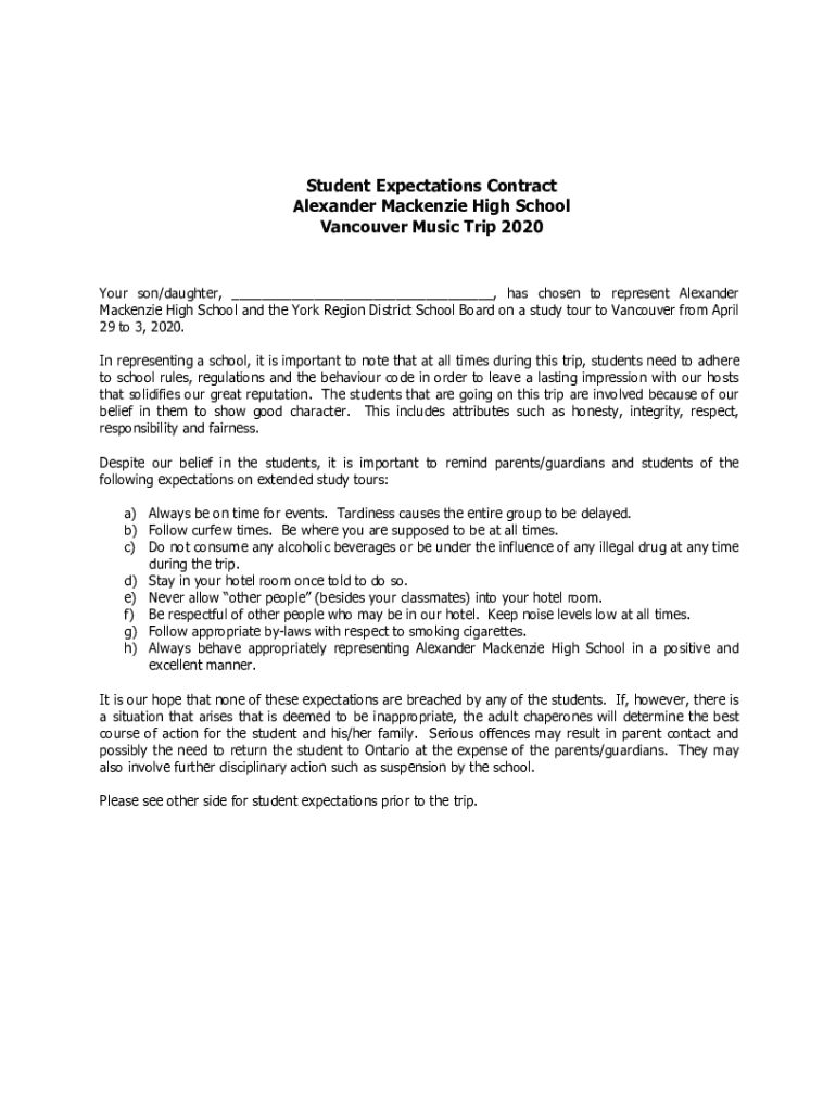 Student Expectations Contract Alexander Mackenzie High School Vancouver Music Trip 2020Your son/daughter, ___, has chosen to represent Alexander Mackenzie High School and the York Region District
