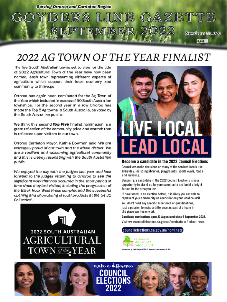 Serving Orreries and Carrie ton RegionGOYDERS LINE GAZETTE September 2022Newsletter No. 320 FREE2022 AG TOWN OF THE YEAR FINALIST The five South Australian towns set to view for the title of 2022