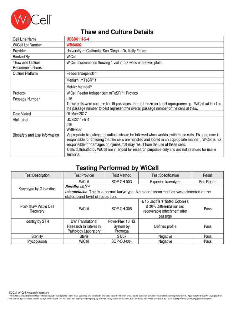 Thaw and Culture Details Cell Line Name Well Lot Number Provider Banked By Thaw and Culture Recommendations Culture PlatformUCSD011i54 WB64802 University of California, San Diego Dr. Kelly Fraser