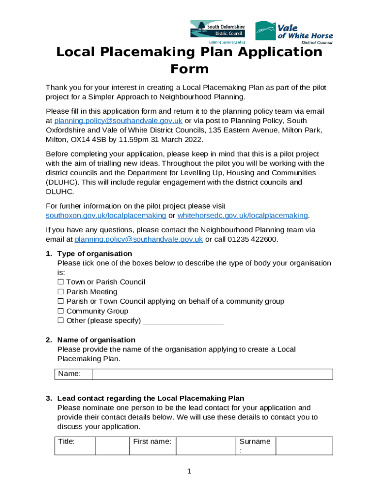 What is Local Placemaking Plan Application Form?