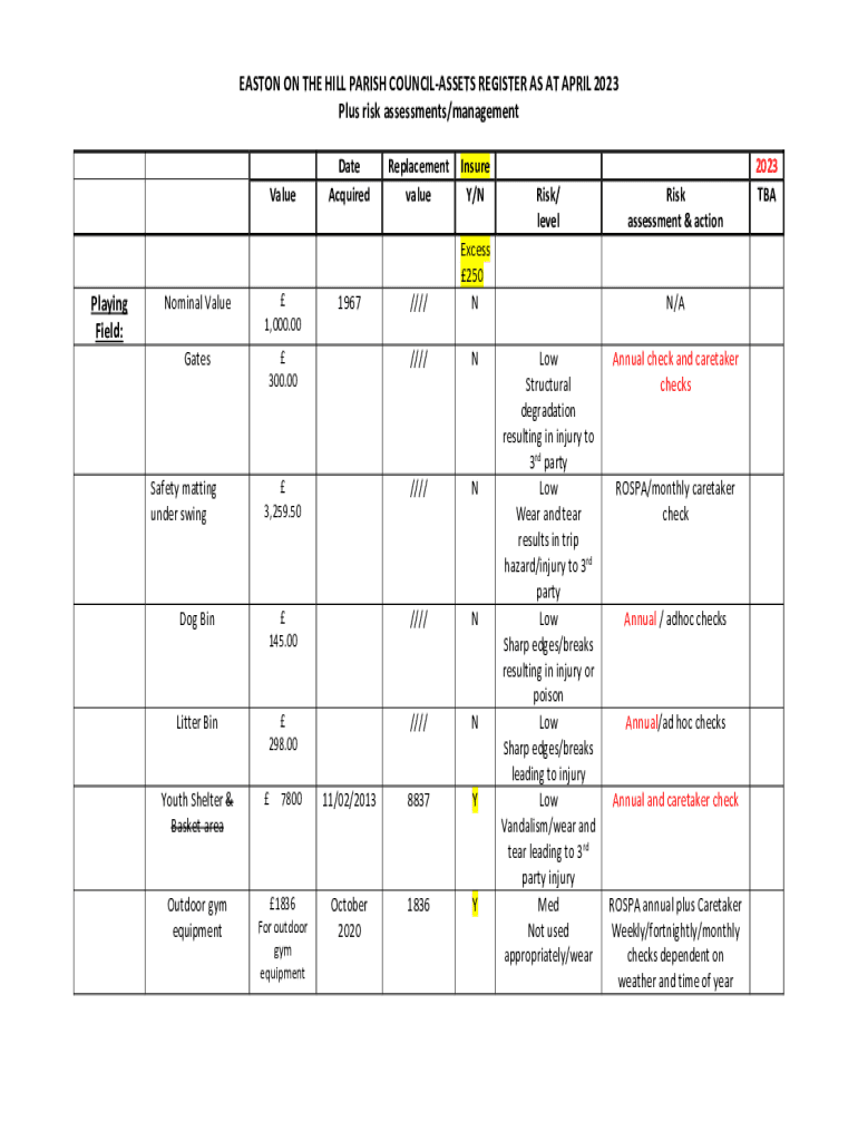 EASTON ON THE HILL PARISH COUNCILASSETS REGISTER AS AT APRIL 2023