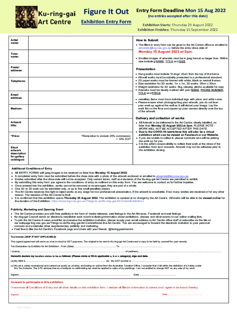 (no entries accepted AER this date)Exhibit Entry FormExhibion Starts: Thursday 25 August 2022