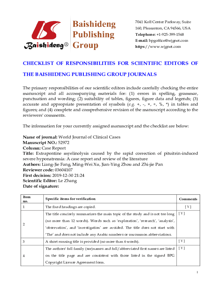 7041 Kill Center Parkway, Suite 160, Pleasant on, CA 94566, USA Telephone: +19253991568 Email: bpgoffice@wjgnet.com https://www.wjgnet.comCHECKLIST OF RESPONSIBILITIES FOR SCIENTIFIC EDITORS OF THE