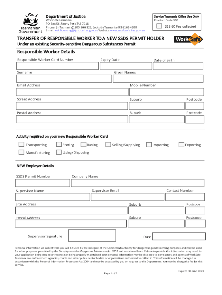 Department of JusticeWorkSafe Tasmania PO Box 56, Rosy Park, TAS 7018 Phone: (in Tasmania)1300 366 322; (outside Tasmania) 03 6166 4600 Email: wst.licensing@justice.tas.gov.au Website www.worksafe.tas.gov.auService