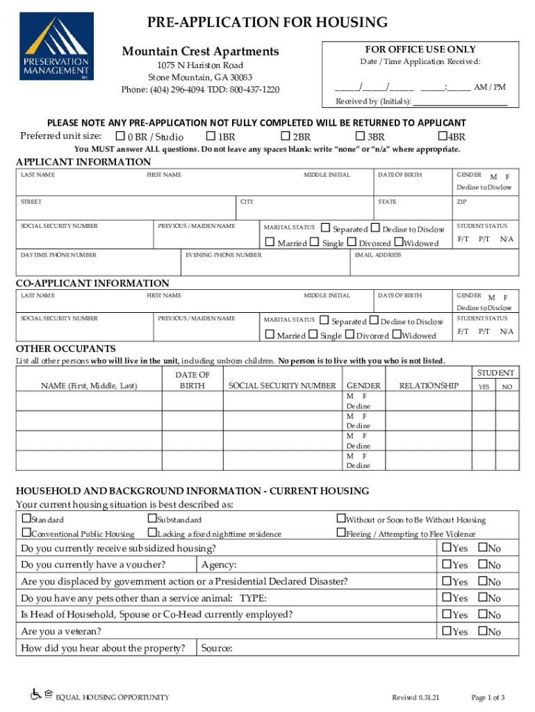 Mountain Crest Apartments OFFICE USE Validate / Time Application Received:1075 N Hamilton Road