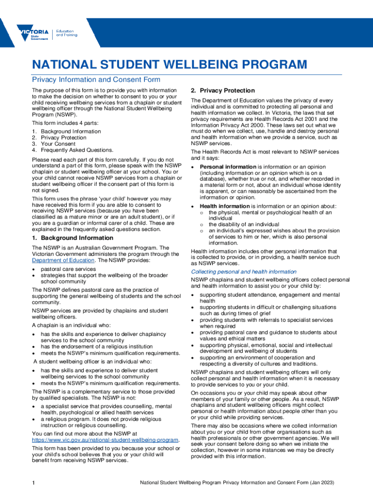 NATIONAL STUDENT WELLBEING PROGRAM Privacy Information and Consent Form The purpose of this form is to provide you with information to make the decision on whether to consent to you or your child