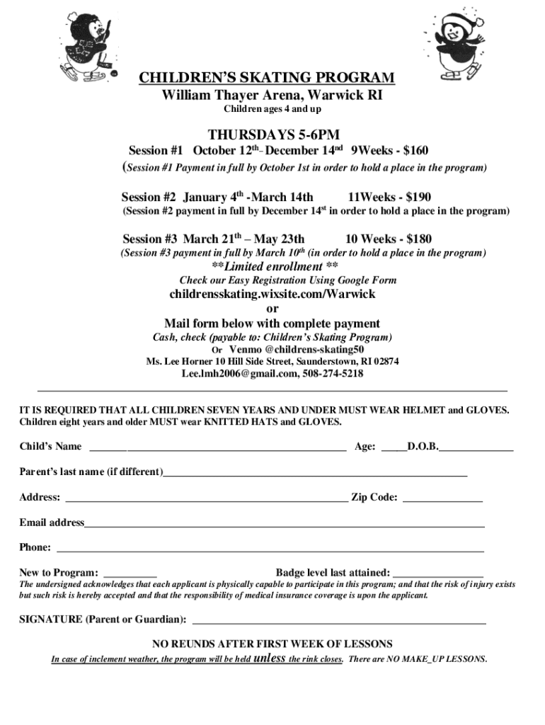 CHILDREN SKATING PROGRAM William Thayer Arena, Warwick RI Children ages 4 and Thursdays 56PM Session #1 October 12th_ December 14th 9Weeks $160(Session #1 Payment in full by October 1st in order to