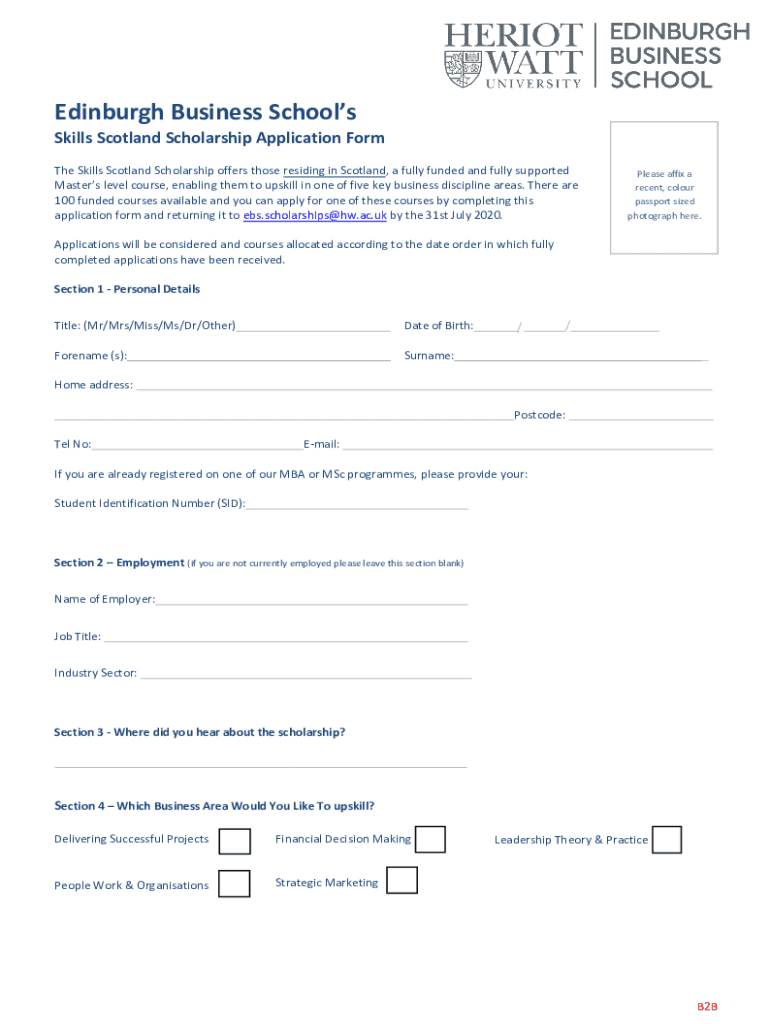 Edinburgh Business Schools Skills Scotland Scholarship Application Form The Skills Scotland Scholarship offers those residing in Scotland, a fully funded and fully supported Masters level course,
