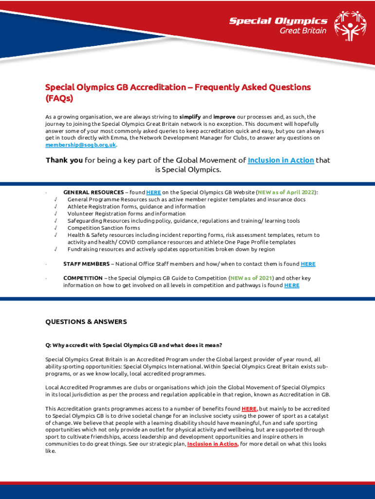 Special Olympics GB Accreditation Frequently Asked Questions (FAQs) As a growing organization, we are always striving to simplify and improve our processes and, as such, the journey to joining the