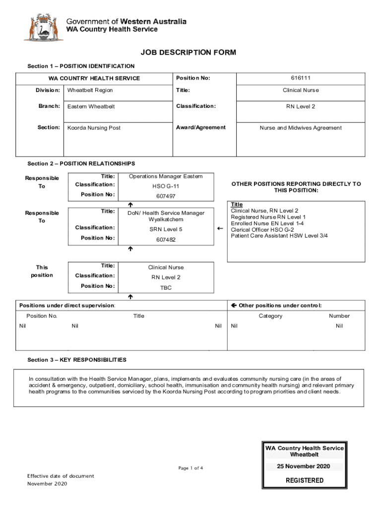 JOB DESCRIPTION FORM Section 1 POSITION IDENTIFICATION Position No:WA COUNTRY HEALTH SERVICE616111Division:Wheat belt RegionTitle:Branch:Eastern WheatbeltClassification:Section:Korea Nursing Postwar/AgreementClinical