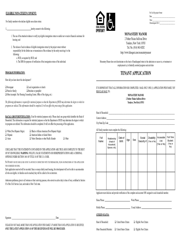 ELIGIBLE CITIZEN CONSENT:For Use By project Owner Date:___ Time:___ Chronological I.D. #___For family members who declare eligible noncitizen status: I, hereby consent to the following:MONASTERY MANOR1.