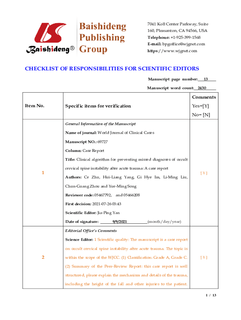 7041 Kill Center Parkway, Suite 160, Pleasant on, CA 94566, USA Telephone: +19253991568 Email: bpgoffice@wjgnet.com https://www.wjgnet.comCHECKLIST OF RESPONSIBILITIES FOR SCIENTIFIC EDITORS Manuscript