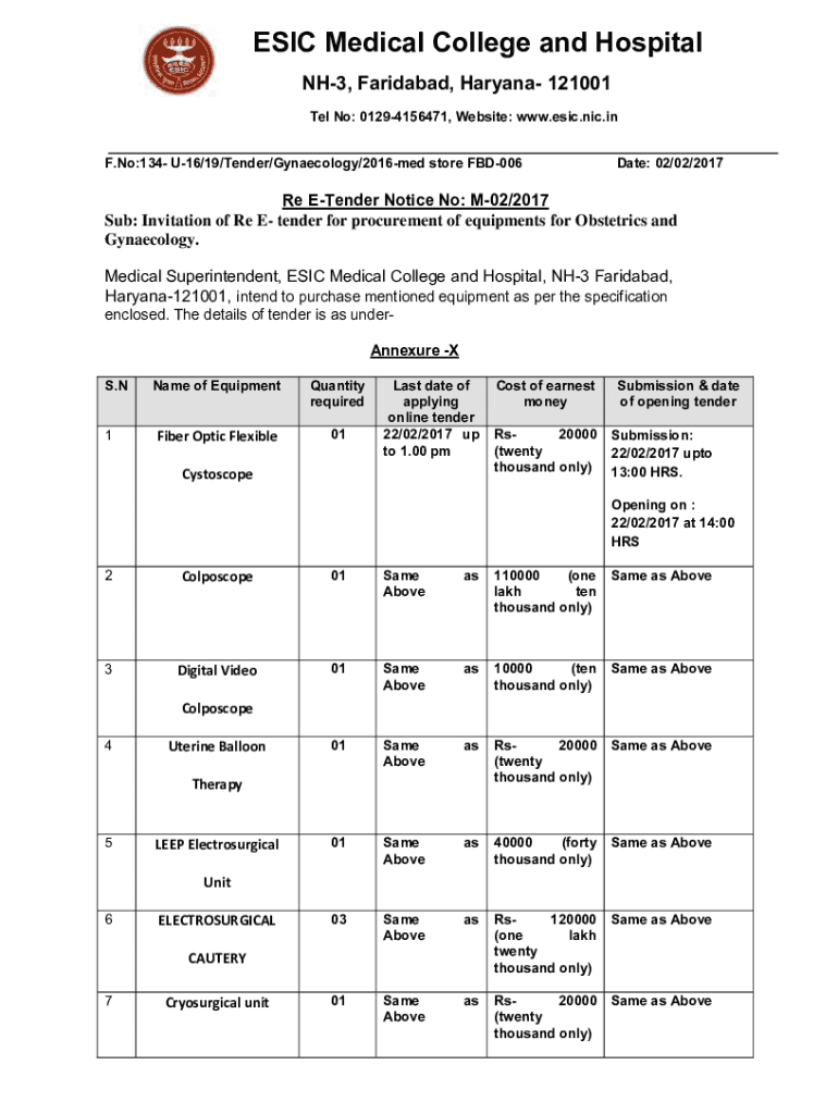 ERIC Medical College and Hospital NH3, Faridabad, Haryana 121001 Tel No: 01294156471, Website: www.esic.nic.in F. No:134 U16/19/Tender/Gynecology/2016med store FBD006Date: 02/02/2017Re Tender Notice