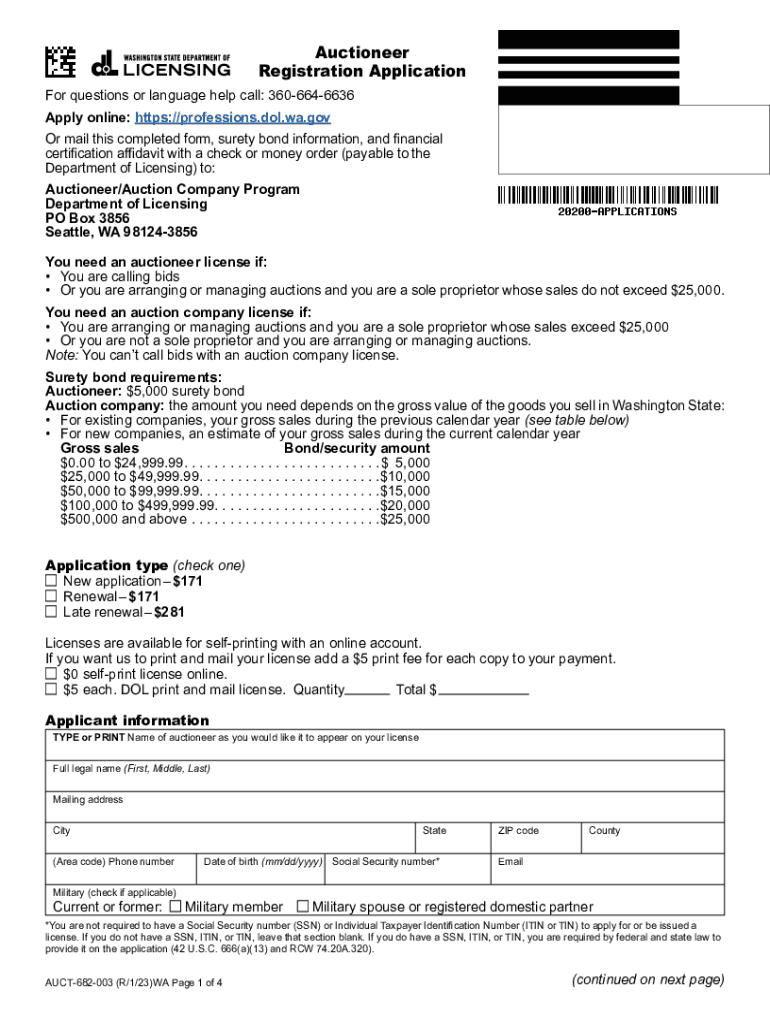 Auctioneer Registration Application For questions or language help call: 3606646636 Apply online: https://professions.dol.wa.gov Or mail this completed form, surety bond information, and financial