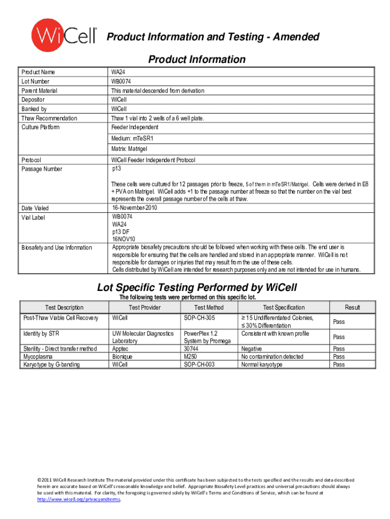 Product Information and Testing Amended Product Information Product Name Lot Number Parent Material Depositor Banked by Thaw Recommendation Culture PlatformWA24 WB0074 This material descended from