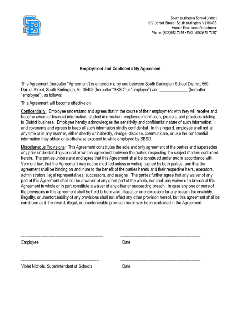 South Burlington School District 577 Dorset Street South Burlington, VT 05403 Human Resources Department Phone: (802)6527255 FAX: (802)6527257Employment and Confidentiality Agreement This Agreement