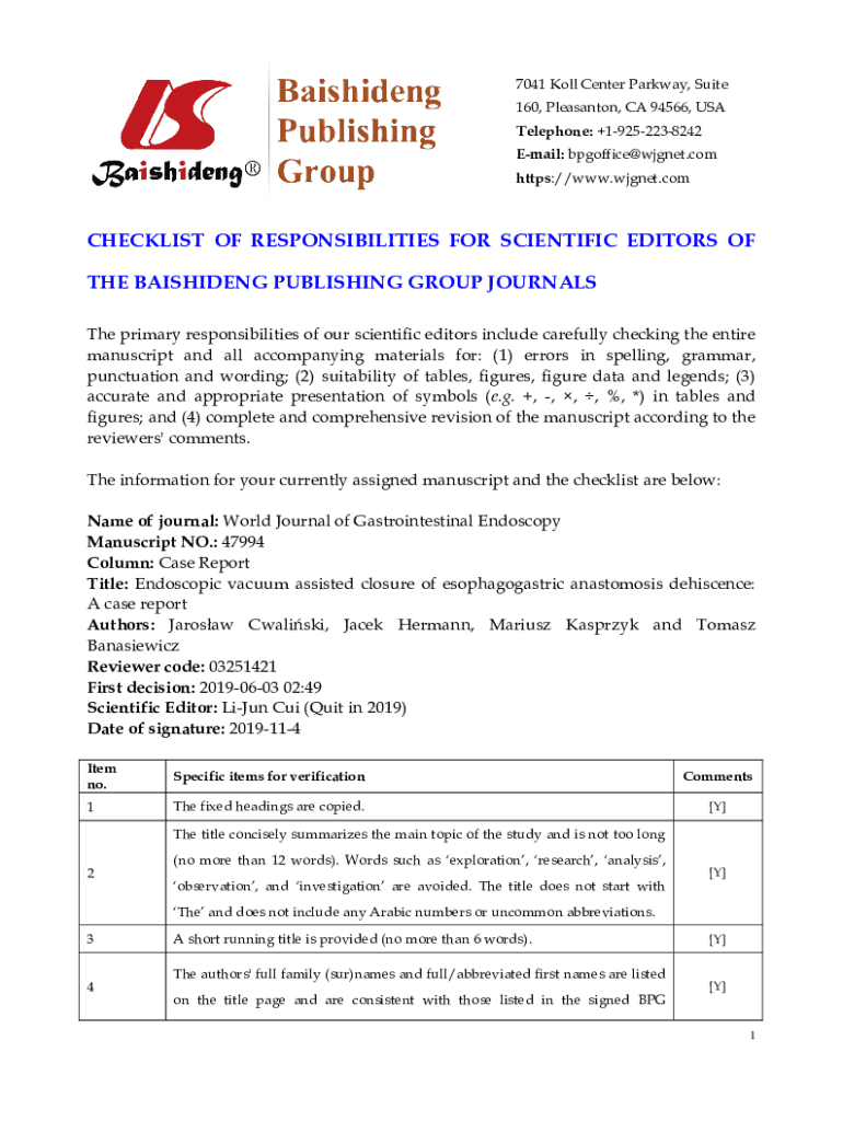 7041 Kill Center Parkway, Suite 160, Pleasant on, CA 94566, USA Telephone: +19252238242 Email: bpgoffice@wjgnet.com https://www.wjgnet.comCHECKLIST OF RESPONSIBILITIES FOR SCIENTIFIC EDITORS OF THE