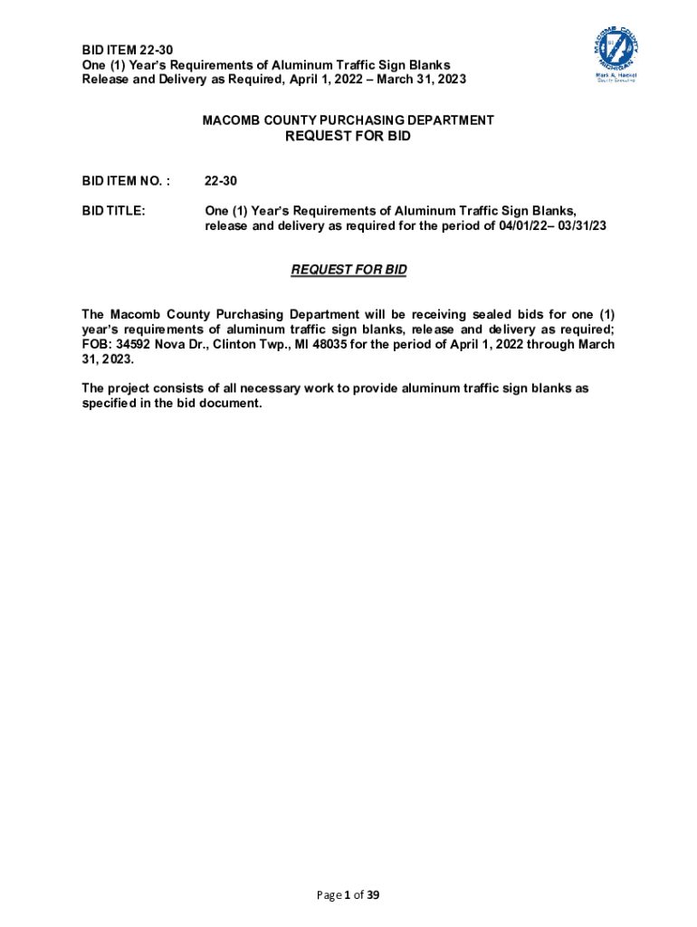 BID ITEM 2230 One (1) Years Requirements of Aluminum Traffic Sign Blanks Release and Delivery as Required, April 1, 2022, March 31, 2023, MACOMB COUNTY PURCHASING DEPARTMENTREQUEST FOR BID ITEM NO.