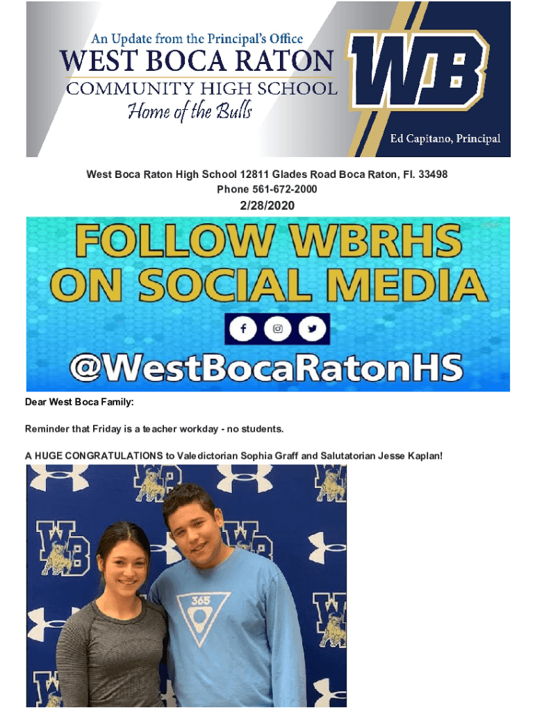 West Boca Raton High School 12811 Glades Road Boca Raton, Fl. 33498 Phone 56167220002/28/2020Dear West Coca Family: Reminder that Friday is a teacher workday no students. A HUGE CONGRATULATIONS to