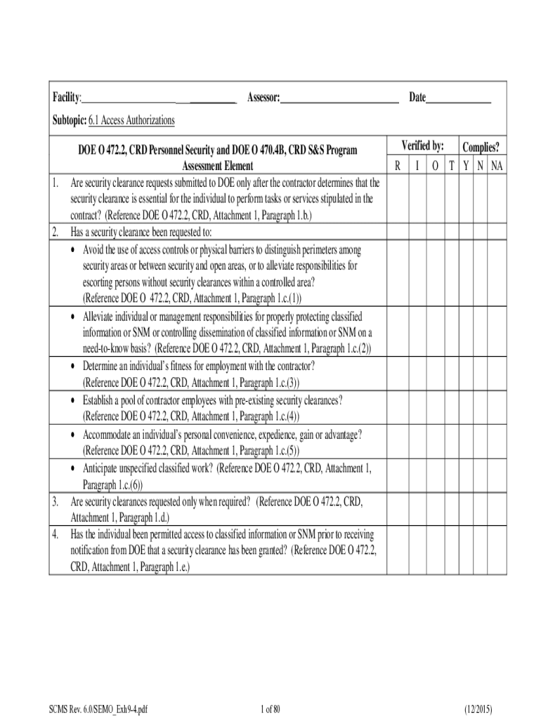 Facility:______Assessor:___Date___Subtopic: 6.1 Access Authorizations1.2.3. 4.DOE O 472.2, CRD Personnel Security and DOE O 470.4B, CRD S&S Program Assessment Element Are security clearance requests