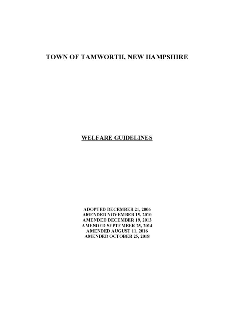 TOWN OF TAMWORTH, NEW HAMPSHIREWELFARE GUIDELINESADOPTED DECEMBER 21, 2006, AMENDED NOVEMBER 15, 2010, AMENDED DECEMBER 19, 2013, AMENDED SEPTEMBER 25, 2014, AMENDED AUGUST 11, 2016, AMENDED OCTOBER