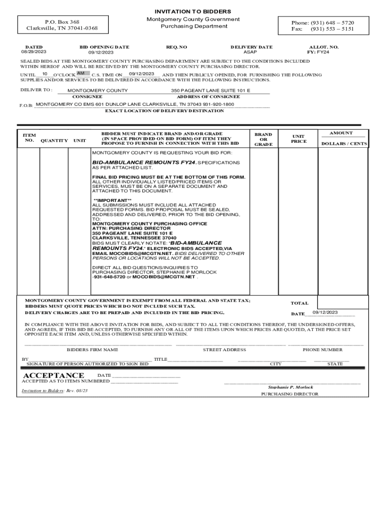 INVITATION TO BIDDERS Montgomery County Government Purchasing Department. O. Box 368 Clarksville, TN 370410368DATED 08/29/2023BID OPENING DATE 09/12/2023REQ. Phone: (931) 648 5720 Fax: (931) 553 5151DELIVERY