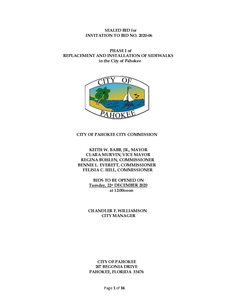 SEALED BID for INVITATION TO BID NO. 202006 PHASE I of REPLACEMENT AND INSTALLATION OF SIDEWALKS in the City of PahokeeCITY OF PAROLEE CITY COMMISSION KEITH W. BABY, JR., MAYOR CLARA MARVIN, VICE