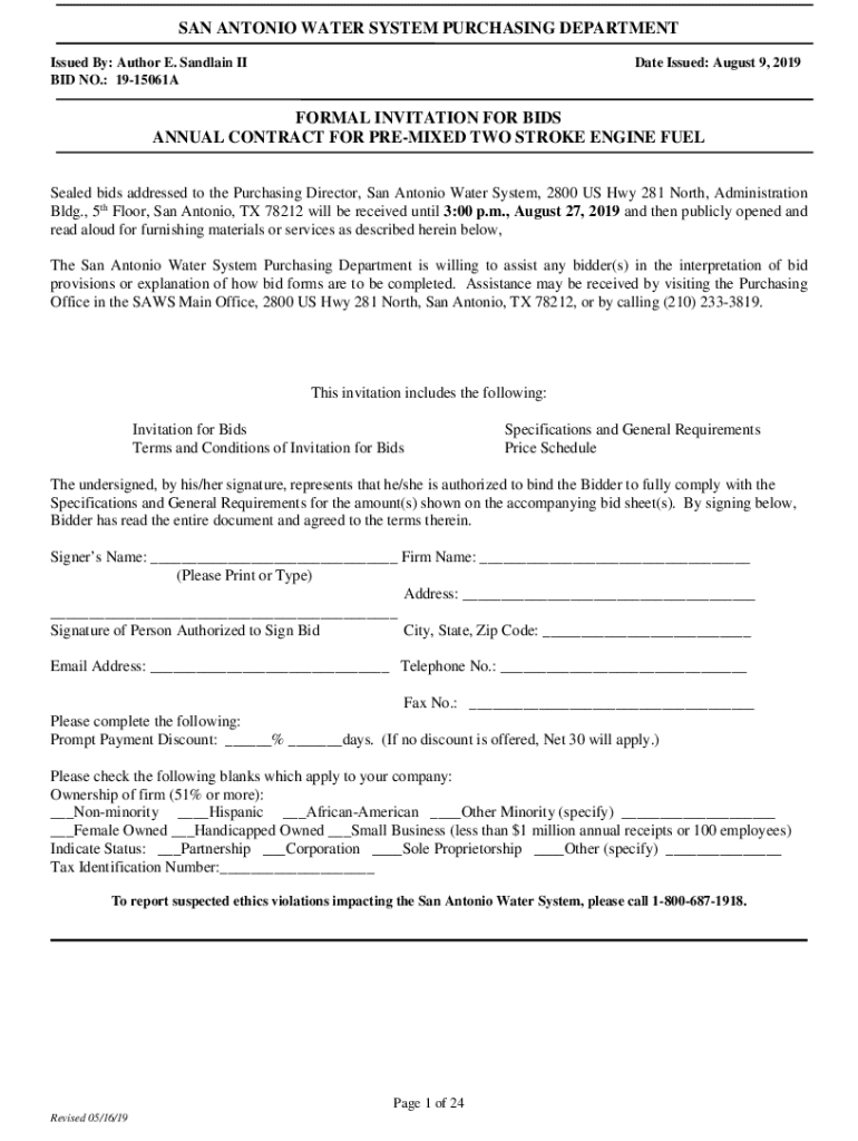 SAN ANTONIO WATER SYSTEM PURCHASING DEPARTMENT Date Issued: August 9, 2019Issued By: Author E. Sand lain II BID NO.: 1915061AFORMAL INVITATION FOR BIDS ANNUAL CONTRACT FOR PREMIXED TWO-STROKE ENGINE