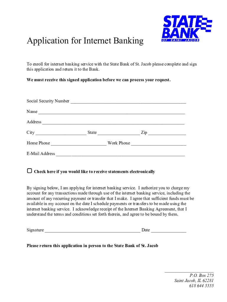 Application for Internet Banking To enroll for internet banking service with the State Bank of St. Jacob please complete and sign this application and return it to the Bank. We must receive this signed