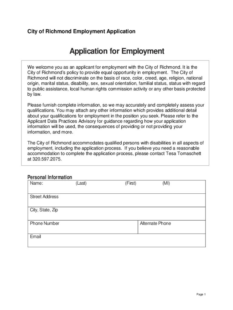City of Richmond Employment ApplicationApplication for Employment We welcome you as an applicant for employment with the City of Richmond. It is the City of Richmond's policy to provide equal opportunity