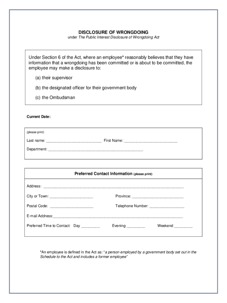 DISCLOSURE OF WRONGDOING under The Public Interest Disclosure of Wrongdoing Asunder Section 6 of the Act, where an employee* reasonably believes that they have information that a wrongdoing has been