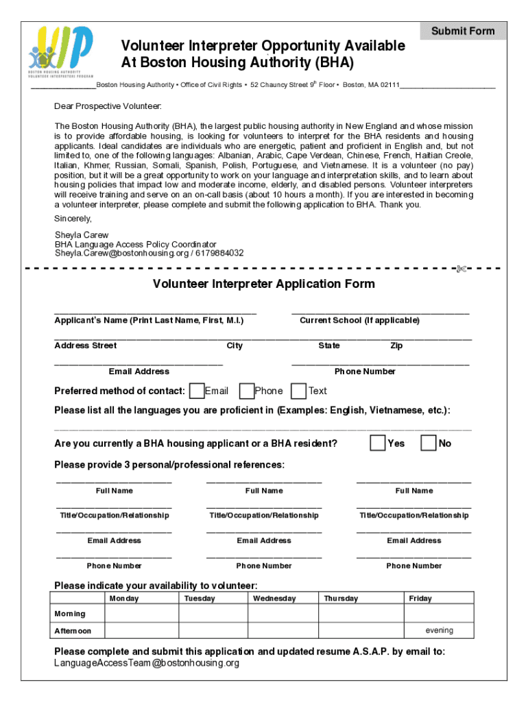 Submit FormVolunteer Interpreter Opportunity Available At Boston Housing Authority (BHA) ___Boston Housing Authority Office of Civil Rights 52 Chauncey Street 9th Floor Boston, MA 02111___Dear Prospective