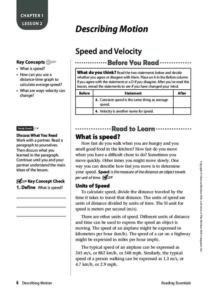 CHAPTER 1 LESSON 2Describing Motion Speed and Velocity Key Concepts What is speed? How can you use a distance time graph to calculate average speed? What are ways velocity can change? What do you
