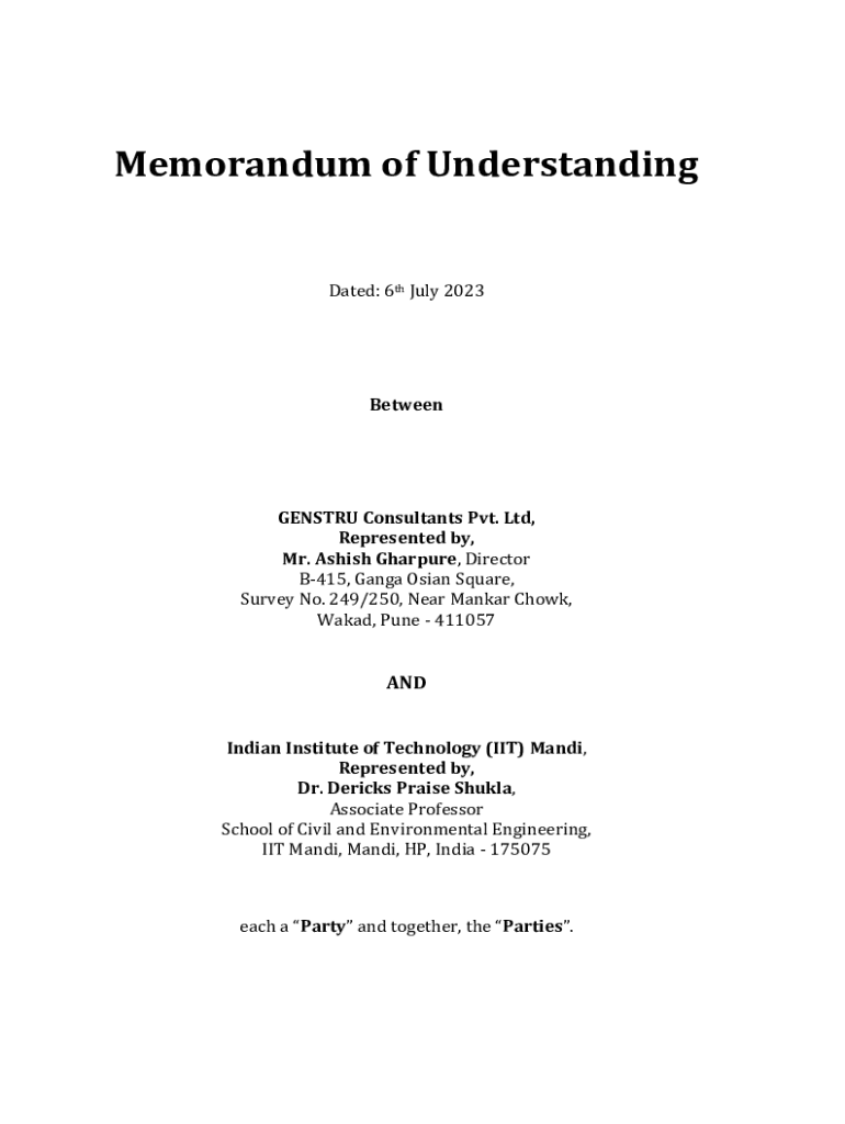 Memorandum of UnderstandingDated: 6th July 2023BetweenGENSTRU Consultants Pvt. Ltd, Represented by, Mr. Ashish Harper, Director B415, Gang Asian Square, Survey No. 249/250, Near Menkar Chow, Waked,