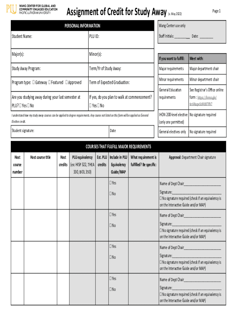 Assignment of Credit for Study Away Page 1(v. May 2022)Wang Center use onlyPERSONAL INFORMATION Student Name:PLU ID:Major(s):Minor(s):Study Away Program:Term/Yr of Study Away:Program type: Gateway