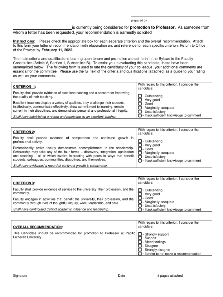 Prepared byes currently being considered for promotion to Professor. As someone from whom a letter has been requested, your recommendation is earnestly solicited. Instructions: Please check the appropriate