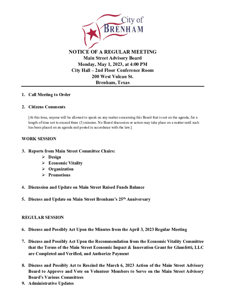 NOTICE OF A REGULAR MEETING Main Street Advisory Board Monday, May 1, 2023, at 4:00 PM City Hall 2nd Floor Conference Room 200 West Vulcan St. Blenheim, Texas1. Call Meeting to Order 2. Citizen Comments