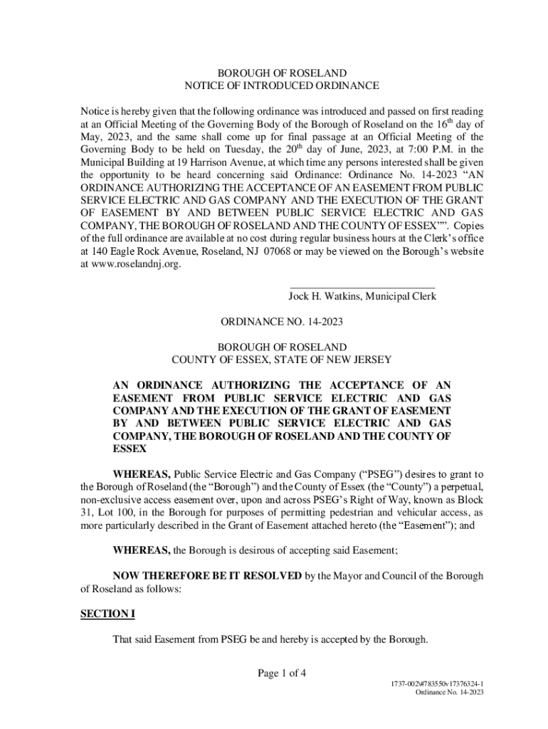 BOROUGH OF ROSELAND NOTICE OF INTRODUCED ORDINANCE Notice is hereby given that the following ordinance was introduced and passed on first reading at an Official Meeting of the Governing Body of the