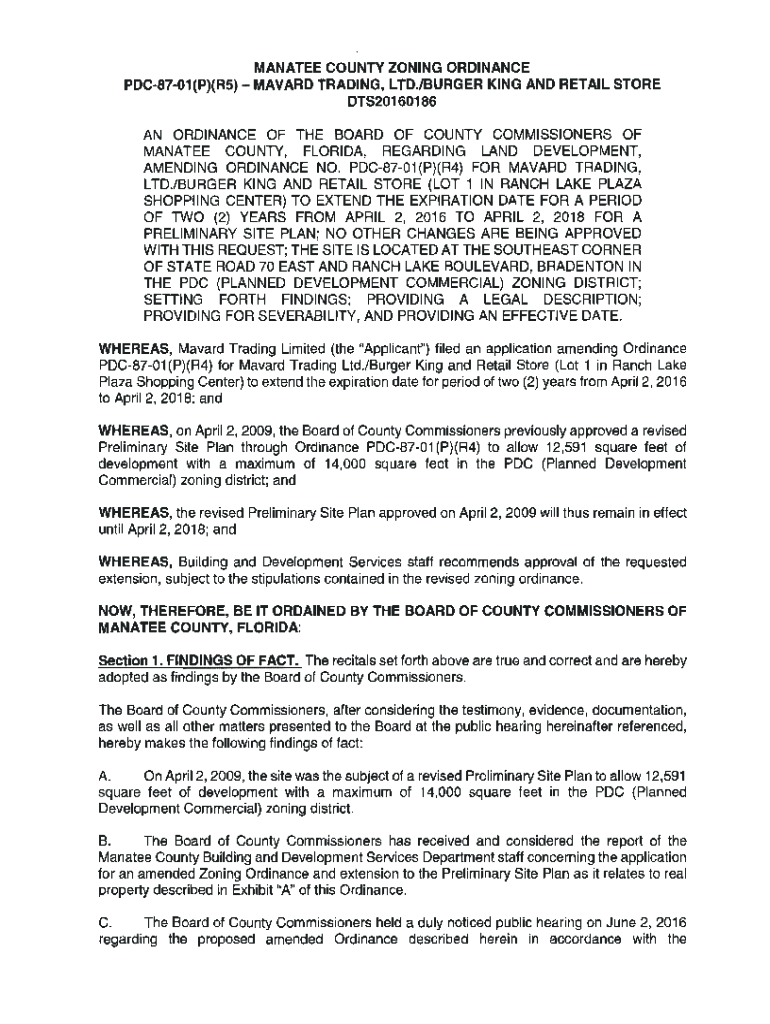 MANATEE COUNTY ZONING ORDINANCE PDC8701(P)(R5) MAV ARD TRADING, LTD./BURGER KING AND RETAIL STORE DTS20160186AN ORDINANCE OF THE BOARD OF COUNTY COMMISSIONERS OF MANATEE COUNTY, FLORIDA, REGARDING