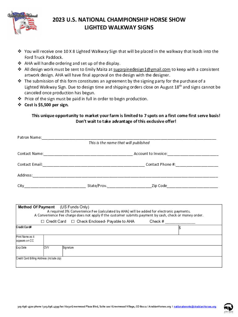 2023 U.S. NATIONAL CHAMPIONSHIP HORSE SHOW LIGHTED WALKWAY SIGNS You will receive one 10 × 8 Lighted Walkway Sign that will be placed in the walkway that leads into the Ford Truck Paddock. AHA, will