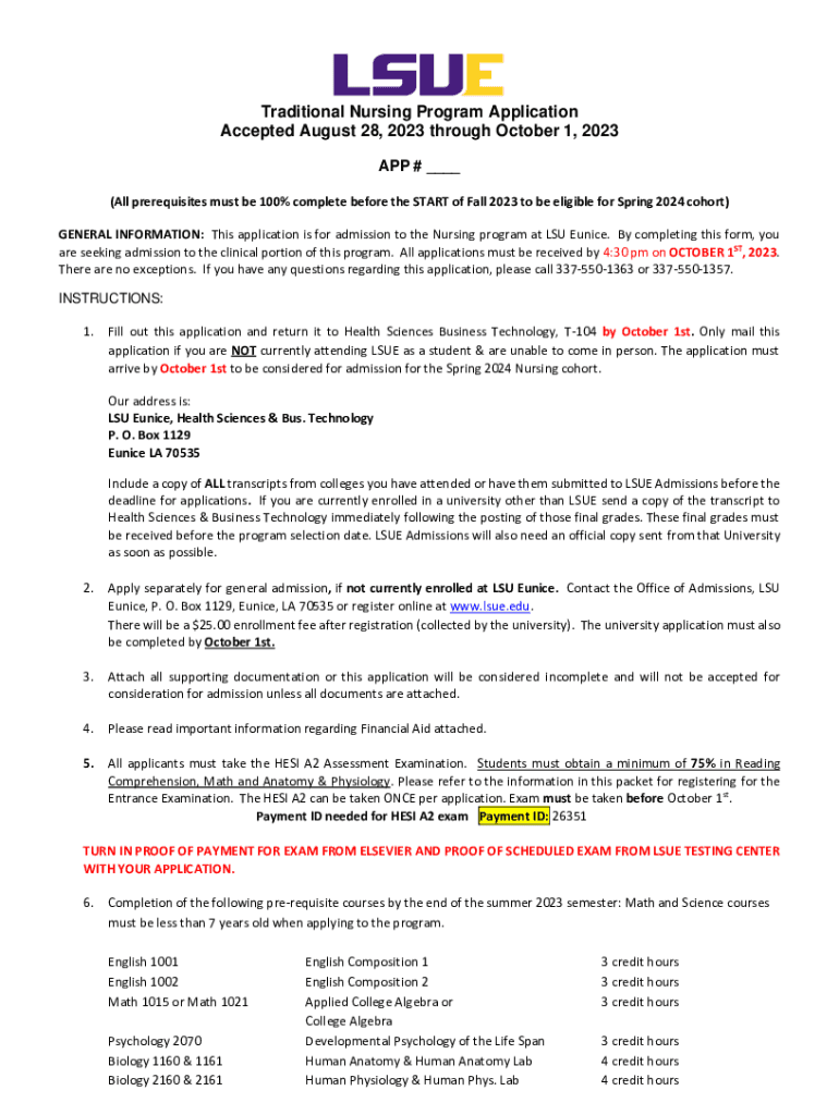 Traditional Nursing Program Application Accepted August 28, 2023, through October 1, 2023, APP # ___ (All prerequisites must be 100% complete before the START of Fall 2023 to be eligible for Spring