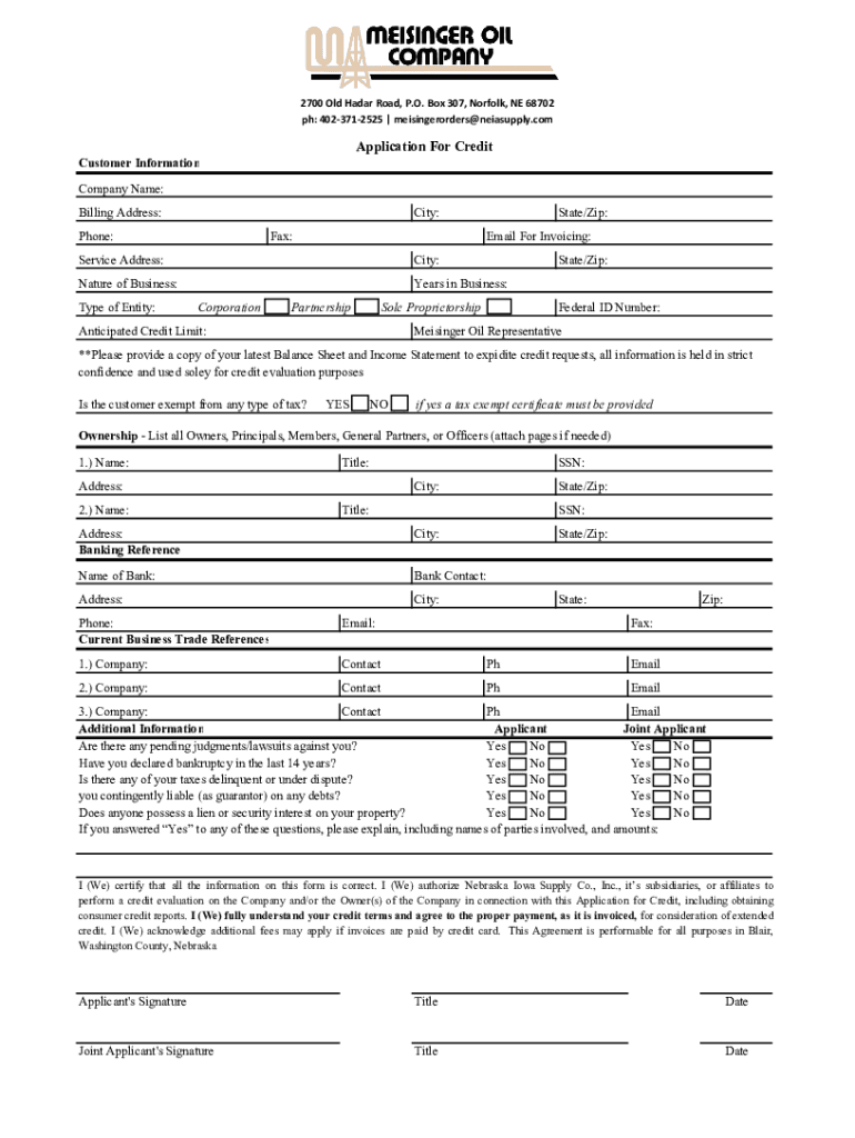 2700 Old Hadar Road, P.O. Box307,Norfolk,NE68702 pH:4023712525|meisingerorders@neiasupply.comApplication For Credit Customer Information Company Name: Billing Address:City:Phone:Fax:State/Zip: Email