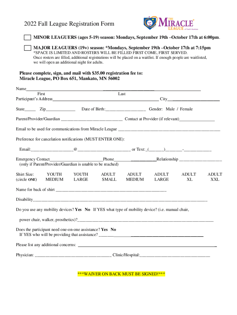 2022 Fall League Registration Form MINOR LEAGUES (ages 519) season: Mondays, September 19th October 17th at 6:00pm. MAJOR LEAGUES (19+) season: *Mondays, September 19th October 17th at 7:15pm *SPACE