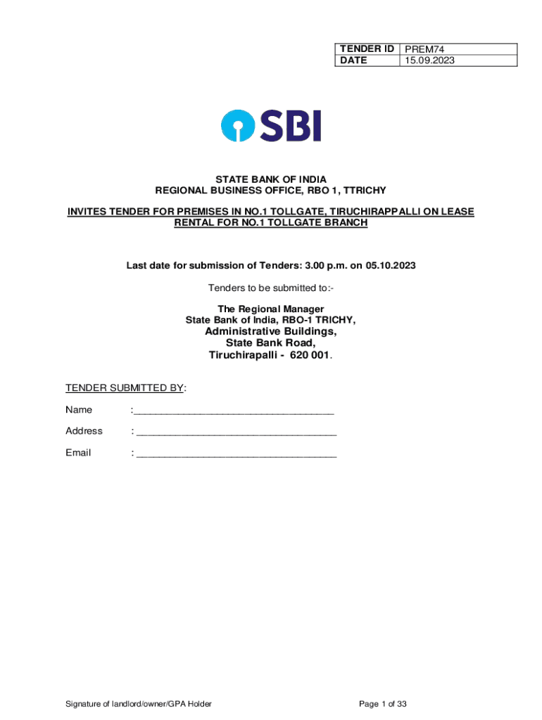 TENDER ID DATEPREM74 15.09.2023STATE BANK OF INDIA REGIONAL BUSINESS OFFICE, HBO 1, TRICKY INVITES TENDER FOR PREMISES IN NO.1 TOLLGATE, TIRUCHIRAPPALLI ON LEASE RENTAL FOR NO.1 TOLLGATE Branches